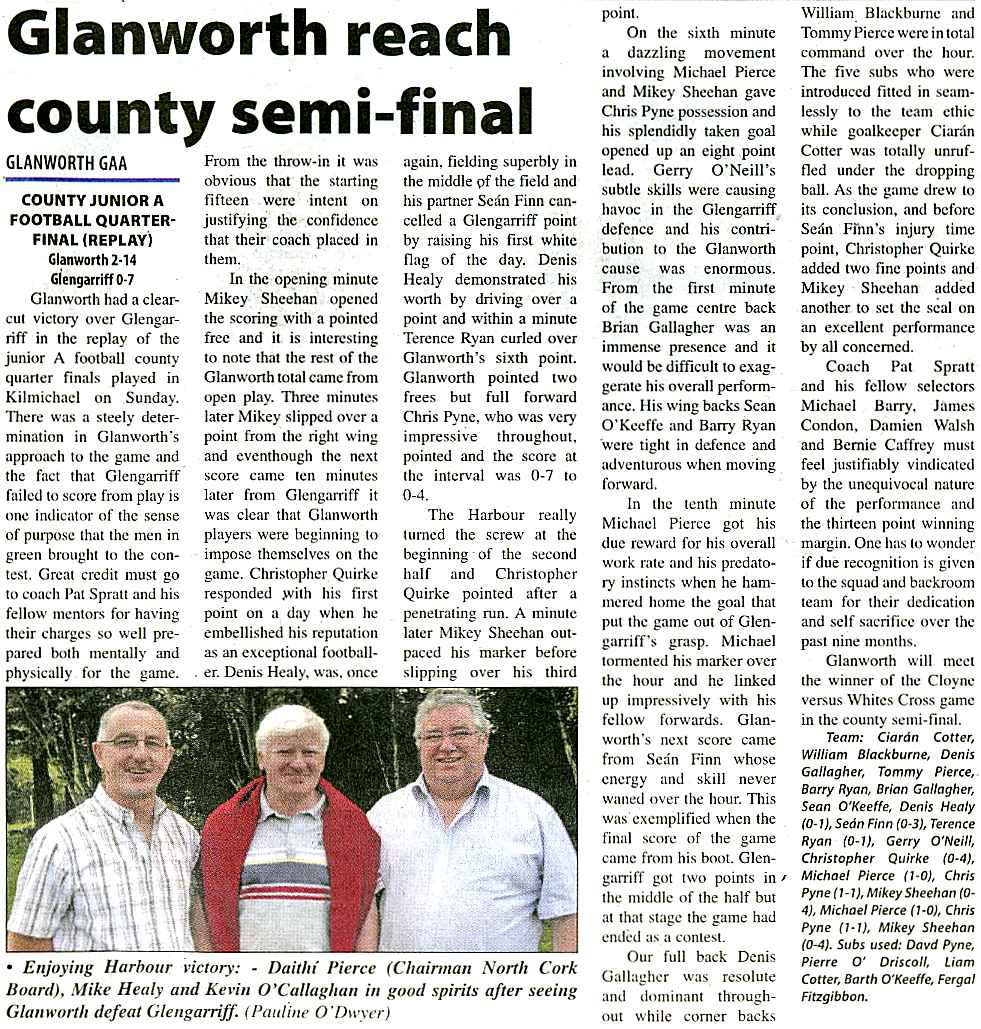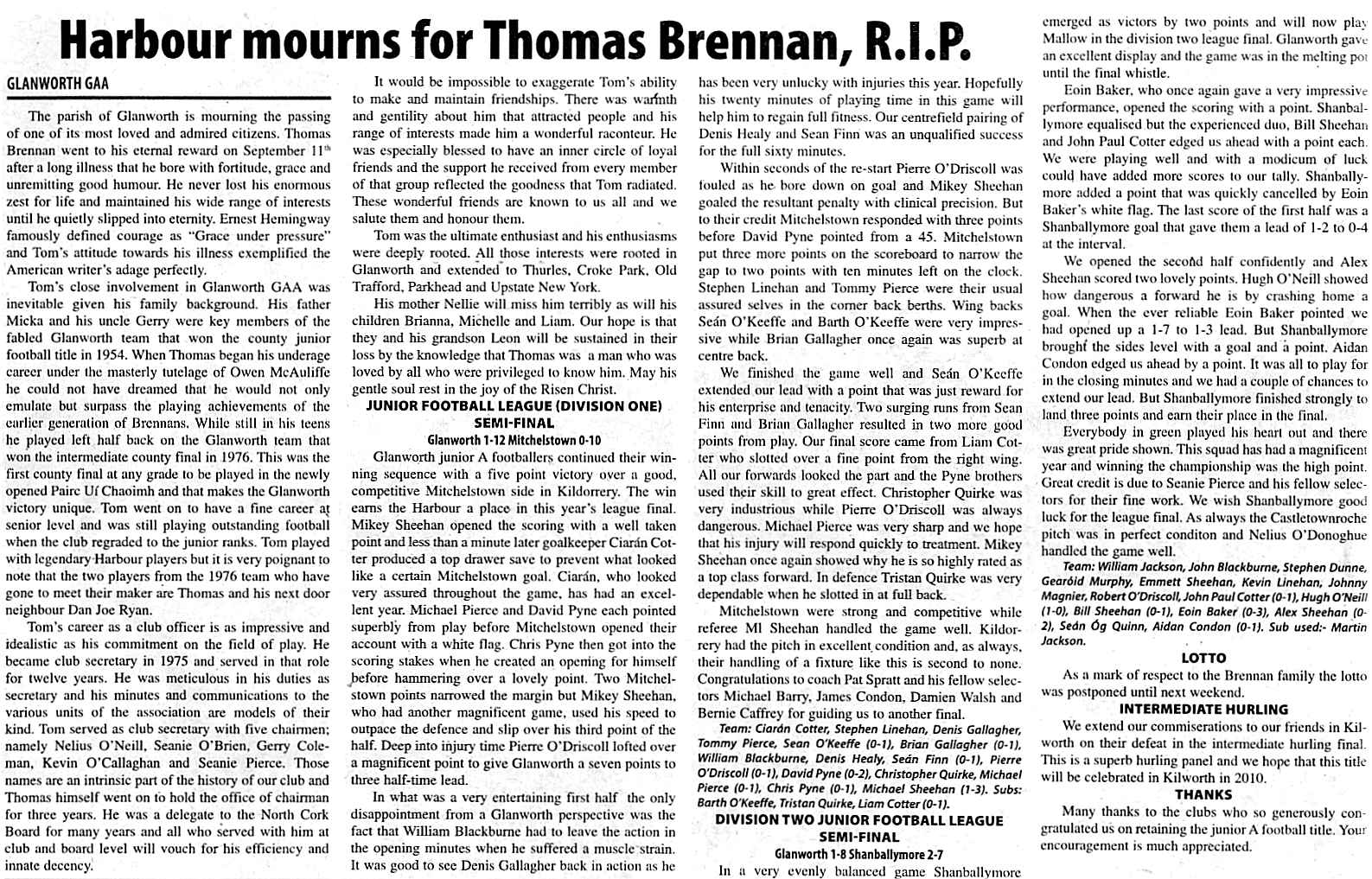 | 17 September | Harbour mourns for Thomas Brennan, R.I.P. | 21 May | Glanworth always in control against Awbeg | 05 October | Glanworth learn lesson and make Glengarriff pay in replay |