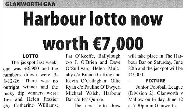 | 11 June | Harbour lotto now worth €7,000 | 14 July | Glanworth hold out for three-in-a row in JBFC 2 | ||