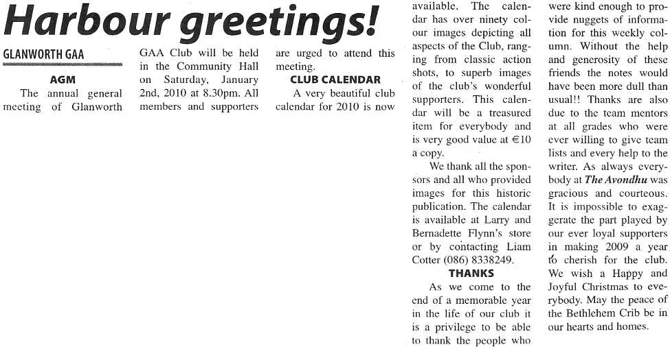 | 24 December | Harbour greetings! | 10 December | Late point for Glanworth secures league and championship double | 8 December | Glanworth grab double |