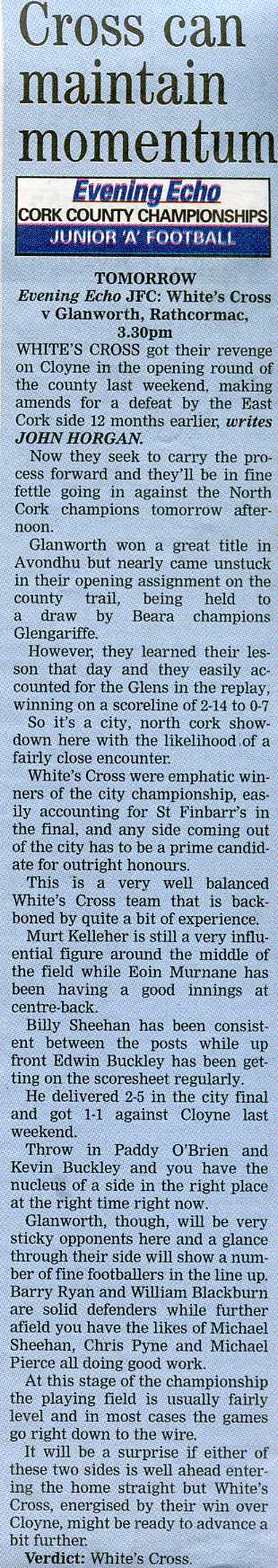 | 08 October | Impressive first prize in forthcoming development Draw | 9 July | Glanworth too strong for Doneraile | 16 October | White's Cross can maintain momentum (Evening Echo) |