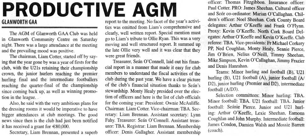 | 06 December | Productive AGM | 30 August | Kildorrery storm to ninth title | 08 September | O'Driscoll stars for Glanworth as Kanturk bow out of title race |