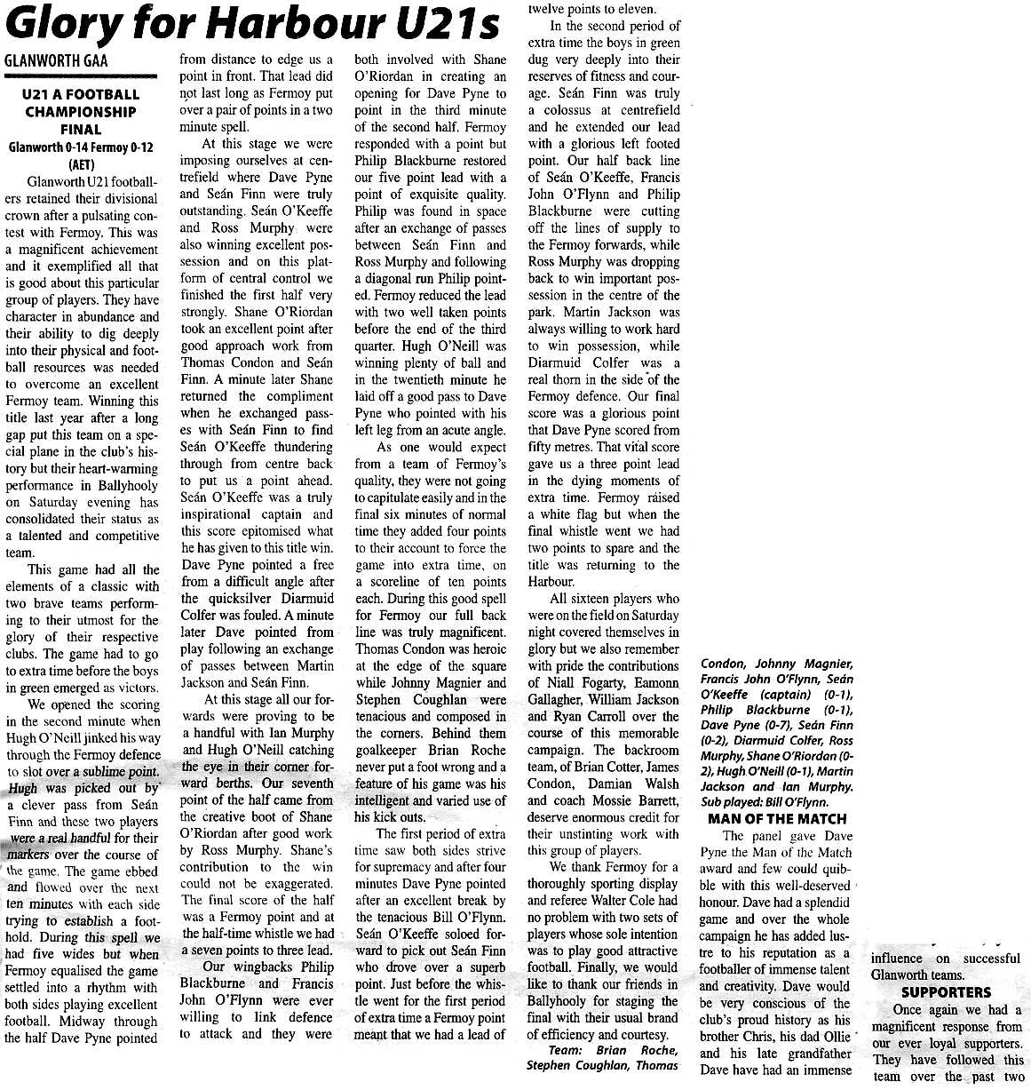| 30 August | Harbour journey comes to an end | 19 April | Glanworth retain U-21A title after extra time win | 10 July | Kilworth come out on top in JAFC replay |