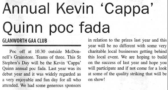 | 20 December | Annual Kevin 'Cappa' Quinn poc fada | 27 September | Glanworth bow out | 24 September | Castletownbere's late charge proves decisive |