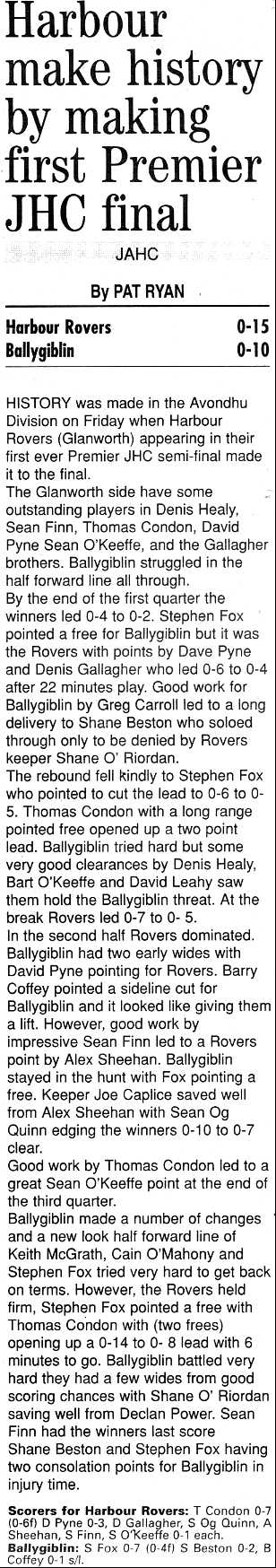 | 27 September | Heartbreak for footballers | 05 July | Glanworth and Kilworth can't be separated after 80 minutes | 06 August | Harbour make history by making first Premier JHC final |